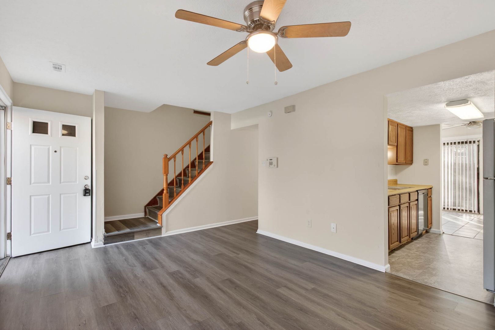 3 bed 2.5 bath Townhome Move-in ready townhome offering fresh, modern updates throughout, including a new roof, fresh interior paint, and brand-new flooring. The galley-style kitchen flows seamlessly into the dining and den area, highlighted by a sliding glass door that floods the space with natural light—ideal for both everyday living and entertaining. This well-designed floor plan features three spacious bedrooms and 2.5 baths, including a convenient half bath on the main level and a private primary suite upstairs with its own en-suite bath. Go outside to enjoy the deck and fenced backyard, perfect for relaxing or hosting guests, along with the added convenience of a rear storage shed for extra space.
